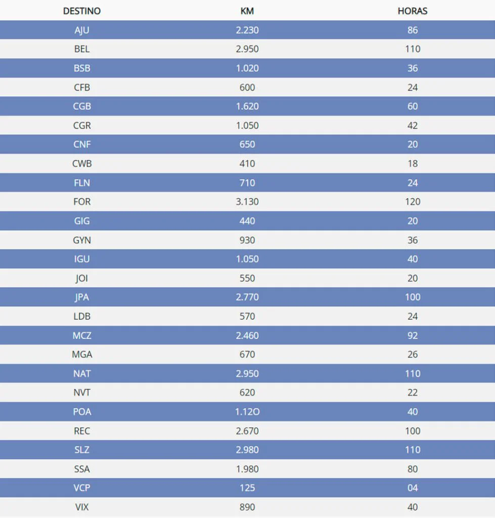 Transit Time estimado em condições normais de tráfego. Adaptado para atender a Lei n.º 13.103 (jornada dos motoristas). Transit Time para caminhão dedicado, não válido para caminhão compartilhado. Pode variar devido à restrição de circulação de caminhões nas grandes cidades, principalmente, nas rotas que passam pela cidade de São Paulo.